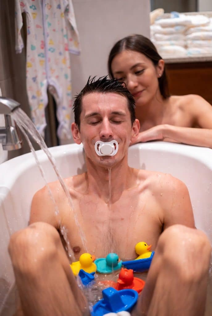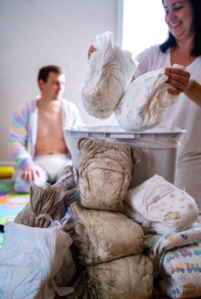 Mornings start with dress up time. I slide him into his favorite pastel onesie, the one covered in smiling teddy bears and little stars, the soft fabric snapping neatly between his legs. Underneath, I choose his diaper for the day, sometimes a thick, puffy disposable printed with cheerful rocket ships and clouds that swell up so perfectly, or a super absorbent cloth diaper with a crinkly plastic cover decorated in tiny choo choo trains. I pop his binkie, his favorite blue one with the shiny silver ring, into his mouth, and off we go. We spent hours playing. I scatter his plush stuffies across the soft mat and we build wobbly block towers together while he rattles his colorful plastic keys. Story time means him curled in my lap, sucking gently on that binkie, eyes wide as I read about friendly dinosaurs. Sometimes we have tickle fights or pat a cake with his favorite teddy, his padded bottom bouncing happily with every clap. Later, I walk into the nursery to tidy up and find the diaper pail overflowing again. The tall white trash can is packed full of his used diapers, some still warm and heavy from the thick overnight kind he wore while napping, others crinkly and printed with playful patterns, all carrying that sweet, powdery scent mixed with the unmistakable proof of my busy baby boy. I smile to myself, roll up my sleeves, and start cleaning. One by one I lift the soggy bundles, tie them neatly in fresh liners, and empty the pail into the big bin outside. The nursery smells fresh again in minutes, ready for more play, more changes, more love. Caring for my ABDL baby is the sweetest job in the world. He may act like a baby, but he’s my little man and I wouldn’t trade a single crinkly, cuddly moment for anything